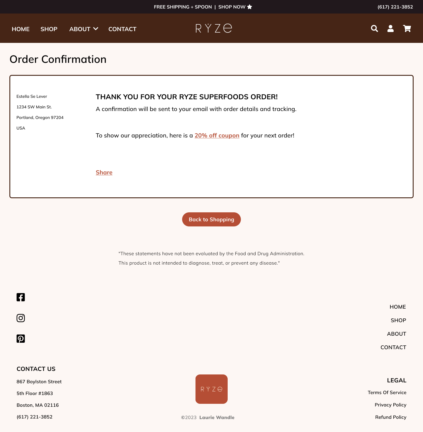 Order Confirmation: Personalized confirmation with customer name, complete order details (shipping address, payment method), reassurance messaging about email confirmation with tracking, appreciation message with 20% off coupon for next order, social sharing CTA